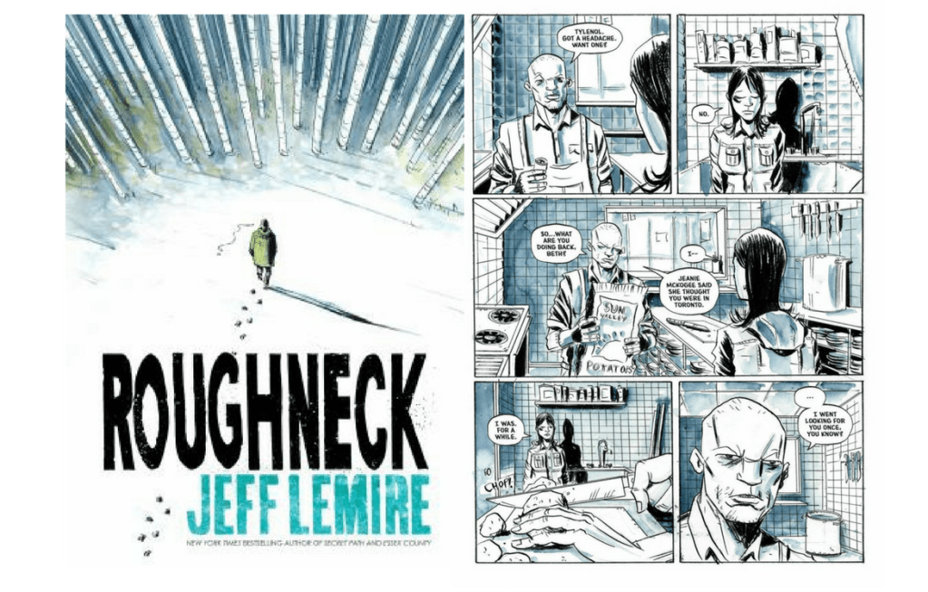 Jeff Lemire’s latest graphic novel, Roughneck, is a beautifully illustrated backdrop to a troubling story that Canadians, sadly, have seen played out so many times. Set in the fictional Northern Ontario town of Pimitamon, Derek Ouellete is a ‘has-been’ hockey player battling his demons from a troubled childhood and hockey career as an ‘enforcer’. While being a ‘thug’ during his career was his role, using his fists in his civilian life has become his mode of communication and the patience of the local constabulary is running thin.