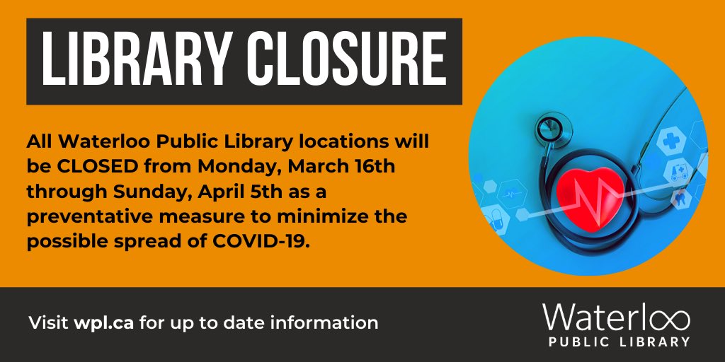 Sunday, March 15, 2020 — In alignment with the City of Waterloo and as a preventative measure to minimize the possible spread of COVID-19, Waterloo Public Library will be CLOSED from Monday, March 16th through Sunday, April 5th, 2020. All programs, events and room rentals are also cancelled during the closure. We anticipate that we will be open regular hours on Monday, April 6th.